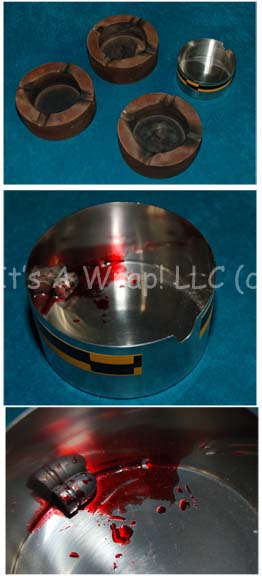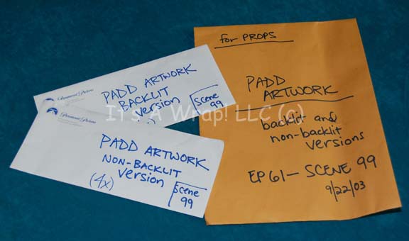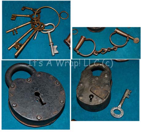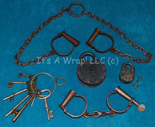 Description: A lot of prop items featured in the Star Trek: Enterprise episode “North Star”. The episode takes the “Enterprise NX-01” crew to a world in the mysterious Delphic Expanse where they discover a group of human beings living at a 19th century American West subsistence level, apparently transported there by aliens. The lot consists of a variety of items appearing throughout the episode: three ashtrays seen in the saloon; two metal hay hooks with wooden handles and two molded rubber hay picks that match for stunt work built around metal interior frames used in the fight scene between “Captain Archer” (Scott Bakula) and “Bennings” (James Parks); a sturdy working padlock and key; a larger padlock; the keys to the jail cell in the sheriffs officer; a set of irons and chains for shackling prisoners; four acrylic Skagaran data chips with silk screened circuitry and adhered translucent gel accents handed out by “T’Pol” (Jolene Blalock); a large brown leather bag used by “Bethany” (Emily Bergl) when packing to go teach the Skagaran children to read; a Skagaran whiskey bottle made from glass and based around tri-lateral symmetry painted silver and with a cork topper along with four practical shot glasses used in the saloon or in the barber shop that “Sheriff McReady” (Glen Morshower) allowed the barber to keep ‘for pulling teeth’; an empty cardboard box labeled in period letting ‘Shotgun Shells, 12 Gauge’; a box of ‘Tremont’ brand name cut nails holding an unknown amount (1 pound) of 1-1.5 inch nails either appearing in the episode or acquired for it; four boxes of squared cornered period playing cards; a bag of white handkerchiefs and a red stained one believed to be stained with special effects ‘blood’; a manila envelope labeled ‘for Props, PADD Artwork, backlit and non-backlit versions, EP 61 – Scene 99, 9/22/03’ that contains two white envelopes adorned with the ‘Paramount Pictures’ logo, each depicting their contents: four non-backlit PADD artworks, and three backlit PADD artworks despite both envelopes listing their contents as ‘(x4)’. The PADD artwork appears as an image of the Wright Brothers flying their airplane at Kitty Hawk with a description printed above and below the image in both English and Skagaran. Finally, a silver colored metal “Enterprise NX-01” sickbay item, a container with a hazardous yellow and black application ringing the outside with the bullet that was ‘taken’ out of Bethany during surgery which is stuck in place because of the dried special effects ‘blood’ that is present.