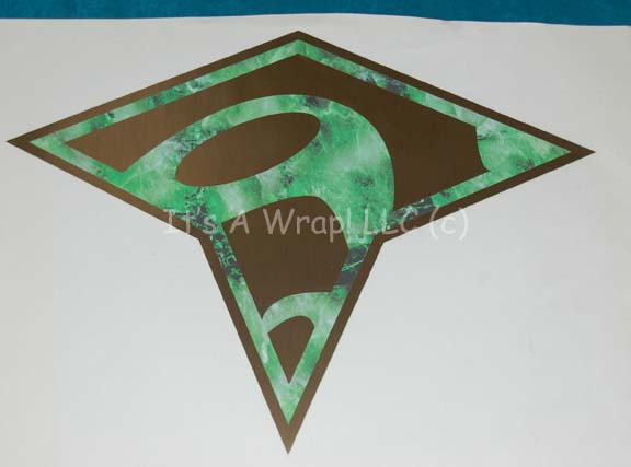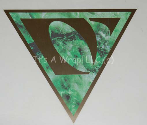 Description: A pair of unused Romulan themed indicator marker applications like those featured in Star Trek X: Nemesis during scenes taking place in the Romulan Senate Chamber. The items are large multi-layered applications employing variously shaped green marble themed layers and metallic gold layers applied on them made to represent Romulan iconographic lettering. One item is triangular in shape, the other is obtusely hexagonal; both are presented on white wax coated white paper measuring approx. 18.25 X 14.25 inches. Look for items like these applied to the floor of the Romulan Senate Chamber set while “Captain Picard” (Patrick Stewart) assures “Shinzon” (Tom Hardy) that the Federation and Romulan Empire could one day learn to trust one another, in time.