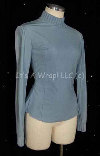 Description: A light blue colored special services division undershirt appearing variously in Star Trek feature films. The item is a long sleeved shirt with a zip up the spine and ribbing at the collar and sleeve cuffs. A sewn in Paramount tag reads ‘W – 10’. The item is intended to be worn by female wearers.