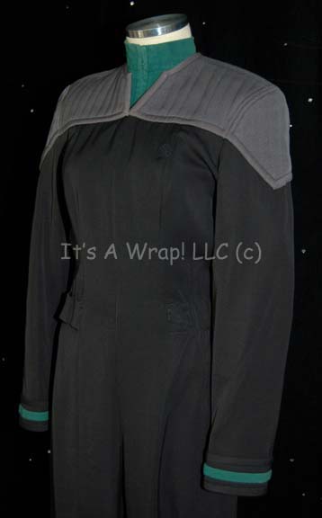 Description: A Starfleet uniform in the style that made its first appearance in Star Trek VIII: First Contact and is comprised of a full-length black jumpsuit with gray quilted shoulders. The jumpsuit features black elastic stirrups at the feet, a form fitting elastic waistband sewn inside with attached loops for ‘away team’ gear, a Velcro patch on the left breast for a commbadge (sold separately), and a Sciences Blue division stripe at the cuff. The uniform zips up the front and comes complete with a separate long sleeved undershirt matching the division cuff color that zips up the front. There is slight fading along the shoulders of the jumpsuit. A sewn in Voyager tag in the jumpsuit reads ‘Lucy Rizo’, a sewn in Deep Space Nine tag reads ‘#067, size 8’; a sewn in Deep Space Nine tag in the undershirt reads ‘Bailey’ and a sewn in Voyager tag reads ‘Valary Miller’.