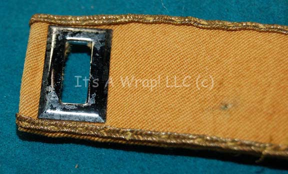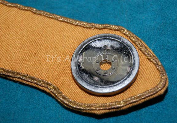 Description: A wardrobe lot created for use on Starfleet officer's uniforms in various Star Trek feature films. The items are gold trimmed engineering division strips; one is made to be affixed to the right shoulder back and clasped to the front of the uniform, the other for the left forearm sleeve. The sleeve strip is adorned by two gold colored metal ’10 year’ service pins with molded in Starfleet emblems and a similarly fashioned commendation bar while the shoulder strip features a ‘security disk’ affixed to the shoulder strip.