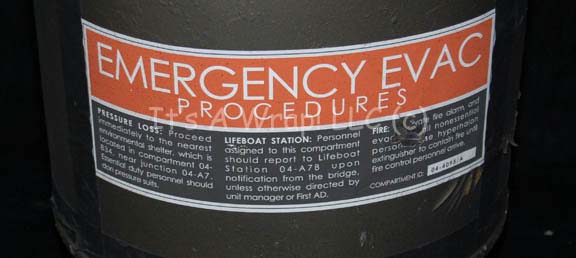 Description: A piece of set dressing similar to those featured in various episodes of Star Trek: Deep Space Nine as kegs at “Quark’s” but altered for use as cargo containers in Star Trek: Enterprise. This item is a hard plastic barrel, painted gun-metal gray and featuring a handle at the top, an open spout, black stripes, and a large Starfleet inventory sticker that reads ‘EMERGENCY EVAC Procedures’ and goes to on to explain what should be done depending on where this container is secured. There are scratches in the paint, a tear in the label, and sand remaining inside from production added to give weight. The item has a height of approx. 15 inches and has an approx. diameter of 11 inches.