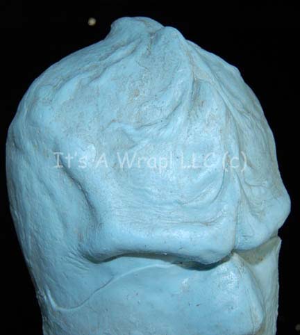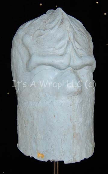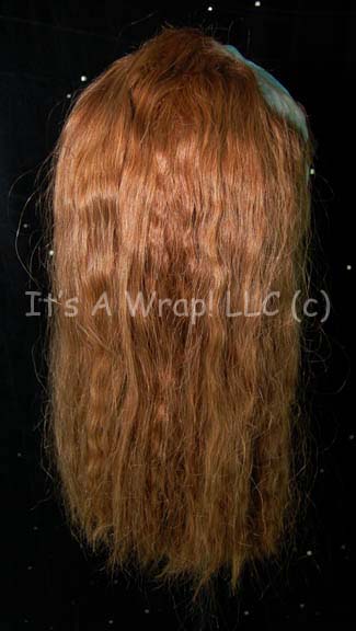 Description: A wig block created for use by the Star Trek hair department for “Worf” (Michael Dorn). The item is a cast head sculpture made to represent the unique styling of Worf’s cranium upon which to set wigs. The item is molded foam with a light blue colored external rubber coating; a hole for mounting is present on the bottom. The wig is cut to fit Worf’s head behind the trademark Klingon ridges and is believed to be real hair with a fine brown tint. A leather string for tying the hair back is present with the wig for styling appearing in Star Trek: Deep Space Nine and most of the 24th century feature films. The wig was located with a costumer’s tag reading ‘Worf 2nd Principle wig’. The block measures approx. 13.75 X 7.5 X 10.25 inches.