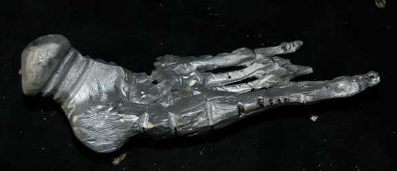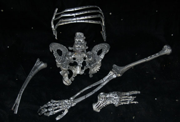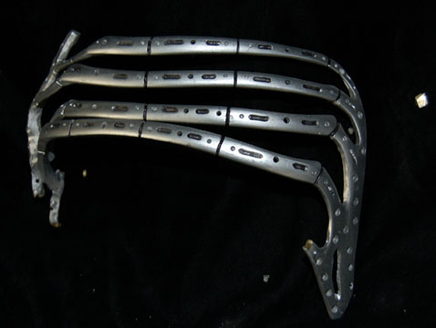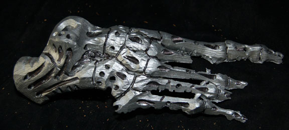 Description: A lot of Borg ‘bones’ featured in Star Trek VIII: First Contact for use in scenes taking place during the dénouement of the film in Engineering. The items are molded resin ‘bones’ painted metallic silver with black adhesive detail lining for a ‘constructed’ appearance, with black nylon cord and metal spring to emulate ‘wiring’. The items represent a femur leg bone, an arm bone from humerus to fingertips, a pelvic bone perforated with small holes, part of the rib cage, and an almost complete foot. The items are distressed to appear ‘savaged’ and ‘torn apart’. The hand doesn’t have all of its fingers. The arm measures approx. 16 inches, the foot 9 X 3 inches, the femur 12 inches long, and the pelvis measures approx. 10 X 10 X 6 inches.