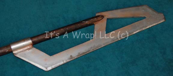 Description: A prop item featured in various episodes of Star Trek: Deep Space Nine. This item is the melee weapon for the Jem’Hadar, the Kar’takin; it is a short, wooden pole-arm type weapon with a weighted metal-colored end, the blade is molded plastic on a metal frame, is long, vaguely triangular, straight edged to a point and made for stabbing and slashing in battle. The item is distressed for effect and is missing the tip of the blade, exposing the metal frame underneath, and measures approx. 37.5 X 6 inches.