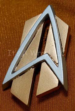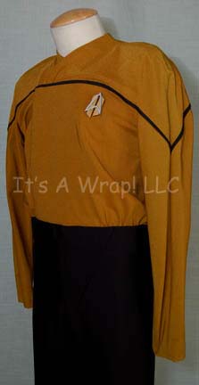 Description: A costume featured in the series finales of both Star Trek: The Next Generation and Voyager. This costume is a future Starfleet uniform consisting of a long-sleeved, full-length, jumpsuit in Operations Gold, a false, wrap-around style, a black horizontal piping across the front, black trousers with stirrups for the feet, Velcro patch for the future style commbadge (included and attached), and a zip up the back. Sewn in tags for both appearances read ‘Star Trek: TNG, Tim Kellemer’ and ‘Voyager, Peter Osinoff’ and a costumers’ tags read ‘Peter Osinoff, party, Future Starfleet’, and ‘ST Voyager, #748, Starfleet, Peter Ostinoff’.