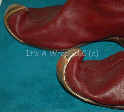 Description: A pair of red colored leather boots featured in Star Trek IV: The Voyage Home for wear by Vulcan Technicians working on the captured Klingon Bird-of-Prey. The boots very likely made appearances on Vulcan Khitomer attendees in Star Trek VI: The Undiscovered Country and could have shown up generally any other time Vulcan characters were needed in traditional costume. The boots are tall and depict use on the soles which are in fine condition, with upturned toes that are colored black. The boots feature an interior label reading ‘Mr. R. Fletcher’ and ‘Michael Ensign’. The boots are made for male wearers and are size 11D.