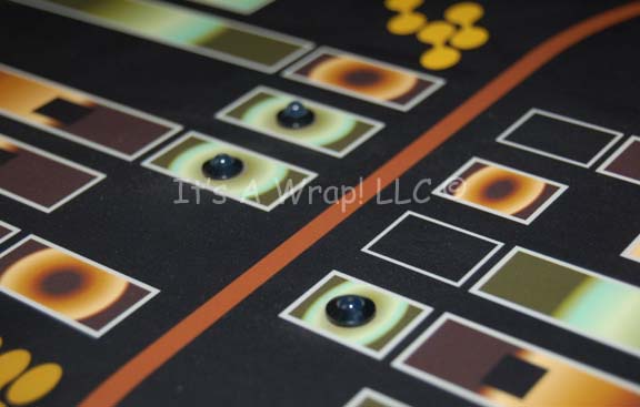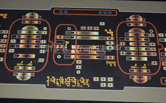 Description: A large console display board featured in the Star Trek: Enterprise episode “Cold Station 12” on the set of the same name. The item is a large piece of smoked acrylic with a large graphical application adhered to the face that depicts multi-colored readouts and gages. Embedded lights are placed generally around the item with copper adhesive strips corresponding to their placement on the reverse. A wire leads from the end of the set, the item has not proven to light. The panel measures approx. 22.25 X 52.25 inches.