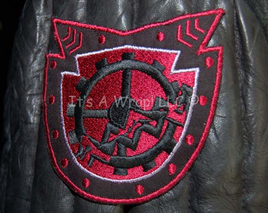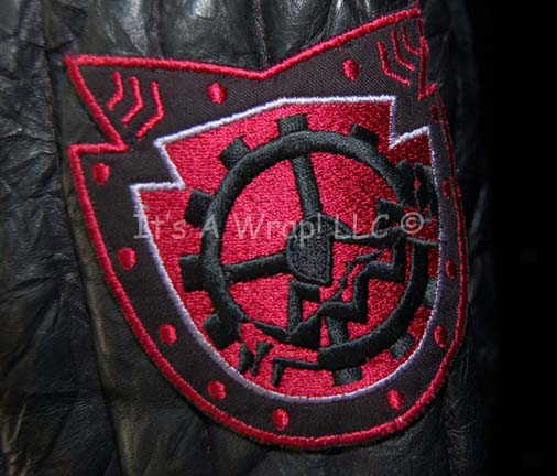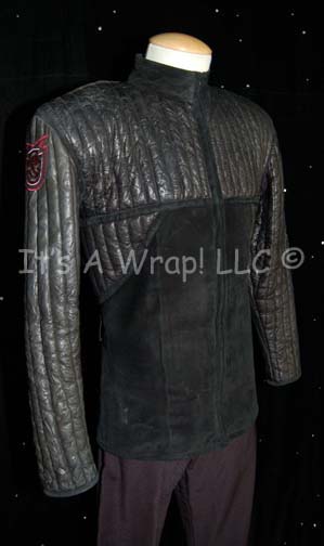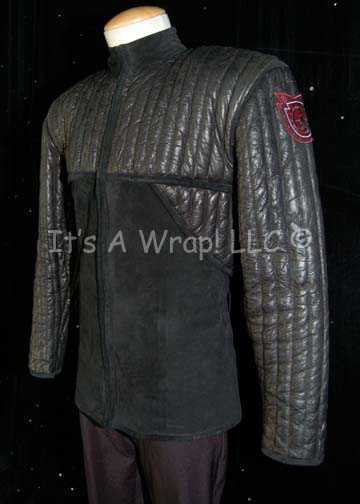Description: A costume reused in multiple episodes of Star Trek episodic television. This costume was first used in the Voyager episode “Resistance” as one of the Mokra, has patches on either sleeve identical to those of the “Communicator aliens” from the Enterprise episode “Communicator”, and then later as one of the Enolian guards in the episode “Canamar”. This costume consists of a sleeveless, full-length, black jumpsuit made mostly of a stretchy, spandex-like fabric with stirrups for the feet; a long-sleeved jacket featuring black, quilted vinyl along the surface of most of the garment, black suede portions on the front and back in addition to suede piping, and patches on either shoulder depicting a black cog on a red background. A sewn in Enterprise tag on both items reads ‘Steve Blalock 43’, the tag in the jacket also denotes wear by Steve Rankin in episode 94, and a costumer’s tag reads merely ‘Voyager, 128 Resistance, Mokra’.