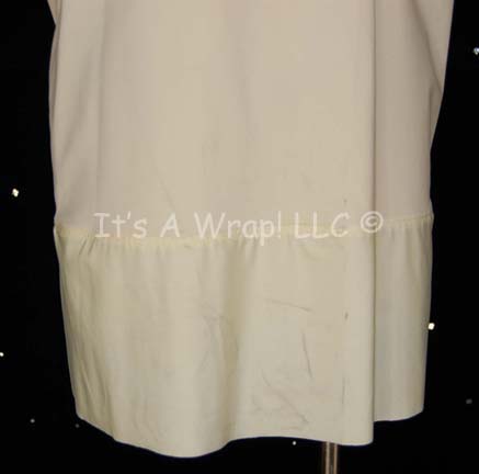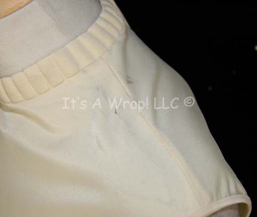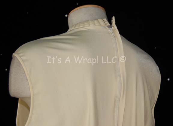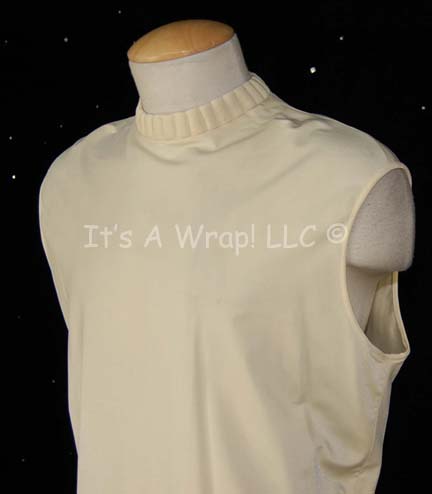 Description: A costume item similar to those featured in Star Trek feature films from “The Wrath of Kahn” until the opening sequences of “Generations”. This item is a sleeveless, Starfleet uniform undershirt in Command White, featuring collar ribbing, a zip up the back with clasps at the neck.