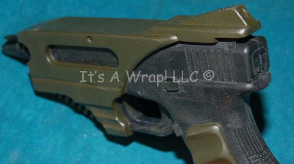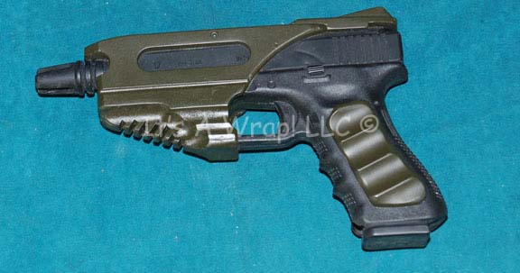 Description: A prop item featured in Star Trek X: Nemesis for use by Kolaran raiders in the ‘Argo’ chase scene. This item is a black, molded-rubber pistol based on the GLOCK 17 featuring an altered muzzle and olive-green accents to make it appear more “alien” The item measures 10 X 6.75 X 3 inches.