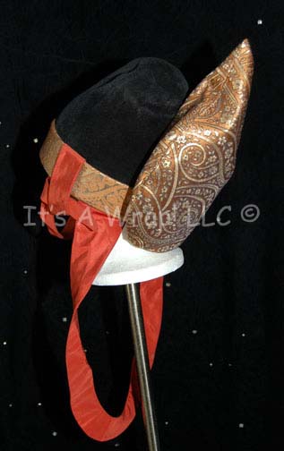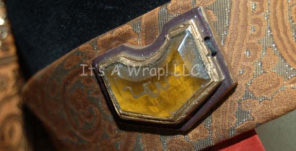 Description: A costume element similar to those featured in various Star Trek feature films. This item is a black, felt heat in the Vulcan-style featuring brown and metallic-gold trim in a floral pattern, a metallic-rust colored chin trap, a second strap that drapes across the chest, and a yellow ‘jewel’ with Vulcan iconographic symbols . In the back, there is a teardrop-shaped, quilted accent featuring a similar floral pattern but the flowers outlined in black. A sewn on Paramount tag reads ‘1-21’.