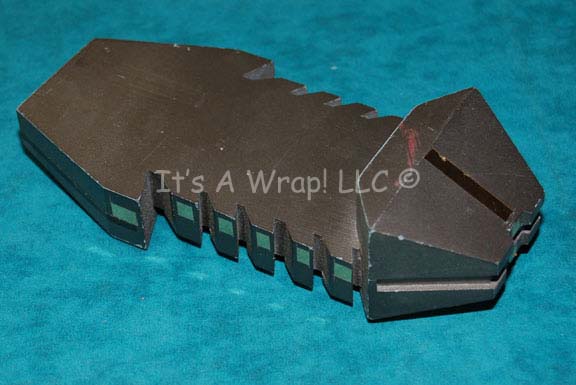 Description: A prop Cardassian PADD (Personal Access Display Device) like those featured in the Star Trek: Deep Space Nine episode “Second Skin”. The item is a high quality solid cast resin hand prop painted metallic gunmetal with metallic copper painted accents, adorned with metallic gold adhesive accents and features the remains of adhesive foam in an inset. The item measures approx. 7.5 X 3.5 X 2 inches.