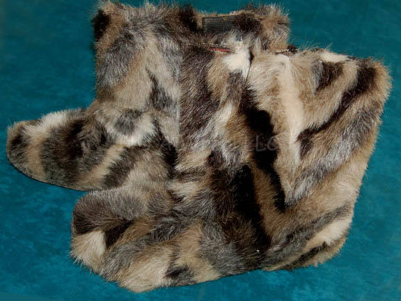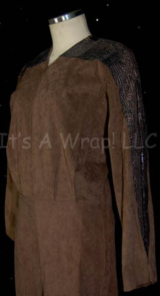 Description: A costume featured in the first season of Star Trek: the Next Generation for wear by Ferengi characters. This costume consists of a long-sleeved, full-length, mauve-colored suede jumpsuit featuring black, vinyl accents across the shoulders, down the sleeves, and encircling the lower legs; stirrups for the feet, and faux fur-lined ankle boots. A costumer’s tag reads ‘TNG Season 1, Ferengi, D. Hancock’.
