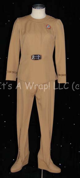 A costume featured in the first Star Trek feature film. This costume is a tan, Class-D Starfleet uniform jacket featuring a sewn on Starfleet emblem with orange backing denoting the wearer to be part of the Sciences division, affixed bio-monitor at the waist, sewn on lieutenant braids on the cuff, … |