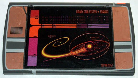 A PADD (Personal Access Display Device) featured in Star Trek episodic television or feature films made from metallic gray plastic with a large ‘display screen' with a black LCARS style graphic meant to be backlit by the device. The graphic depicts a binary star system in collusion with the title … |