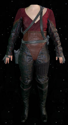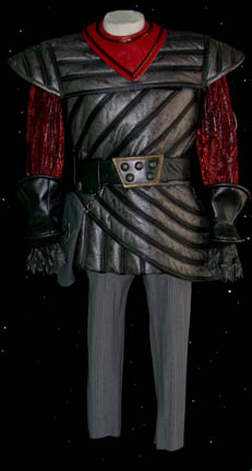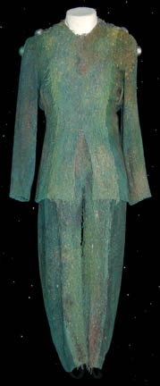 This Cardassian costume was worn during the Deep Space Nine episode “Tribunal” and features a sea foam green and blue top with gray trim. It is made of fabric over wetsuit material and there is a zip up the back. The pants are made of gun metal gray Lycra with … |