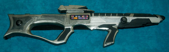 A molded foam prop Starfleet phaser rifle the style of which was first seen in Star Trek VIII: First Contact. Painted metallic gunmetal with black painted raised details, and a graphical application as well as a black nylon strap, this well preserved prop measures approx. 36 X 9.5 X 2.5 … |
