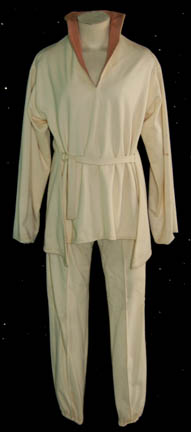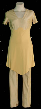 A costume featured in Star Trek I: The Motion Picture, cream colored trousers with a matching top. The top features long sleeves, a waist tie, and a brown colored heart shaped collar. The item is in the style which the “Ilia Probe” (Persis Khambatta) wore on the “USS Enterprise” while … |