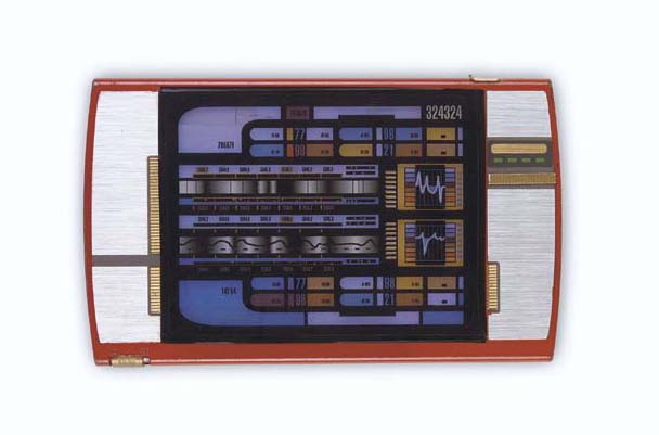 A prop handheld data device made from a backlit slide viewer, painted red, with tape and plastic surface details and a backlit transparency graphic screen image [internal battery-powered lighting untested] -- <I>4½x7½in.</I> -- made for LeVar Burton as Chief Engineer Geordi La Forge in <I>Star Trek: Nemesis</I> |