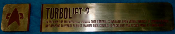 Painstakingly removed from a set piece before striking, this lot of door signage is believed to have appeared on the set of the “Enterprise-E” in Star Trek X: Nemesis. The items are reflective gold colored with brown lettering on a plastic strip. The item reads ‘Turbolift 2' and lists how … |
