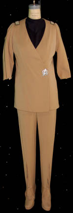 A tan colored Starfleet Class-C jacket wrap featured in Star Trek I: The Motion Picture. The costume is a set of tan trousers with attached shoes, and a black dickie for wear under a matching tan jacket with cropped sleeves, metallic pewter Starfleet emblem badge affixed over the Velcro interior … |