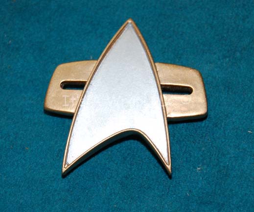 A molded resin Starfleet combadge made in the style first appearing in Star Trek VII: Generations and in the following films, then going on to appear in Star Trek: Deep Space Nine and Voyager. The item is painted metallic gold and silver and the reverse is hollowed out to allow … |