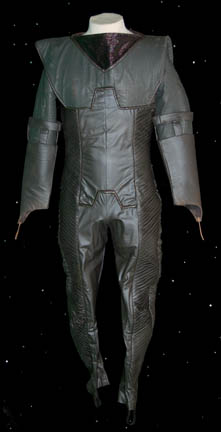 A Romulan uniform featuring a form fitting black jumpsuit with black elastic stirrups at the feet, a zip in the back and clasps at the top. Includes a silver patterned uniform jacket with offset zip on the right breast, and a belt and harness made in the style of Romulan … |