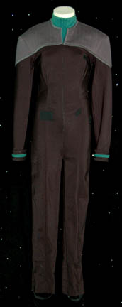 A full-length one-piece uniform jumpsuit with a purple body and tan shoulders, forearms, and legs that zips up the back and comes complete with detachable shoulder pads and a metal Bajoran combadge. The costumer's tag indicates use by various actresses during episodes of Star Trek: Deep Space Nine. |