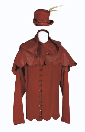 A red wool jacket, with label inside inscribed with <I>Michael Dorn</I>, with a pair of red stretch knit tights, a hat, and a red imitation leather cowl - worn by Michael Dorn as Worf playing <I>Will Scarlett</I> in "Qpid" in <I>Star Trek: The Next Generation</I>; with corresponding wardrobe tag (4) |
