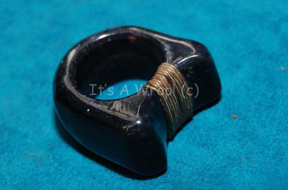 A prop costume ring like those appearing variously in Star Trek feature films and episodic television. The item is a handmade black plastic ring with a copper colored wire embellishment wrapping. The item measures approx. 1.25 x 1.5 X 0.75 inches. <BR |