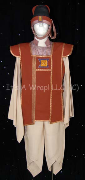 A costume similar to those featured in various Star Trek feature films. This costume consists of a long-sleeved, off-white shirt, tan-colored, bell-sleeves, and a dickie sewn on top featuring a reflective silver and violet checkerboard pattern and trousers matching the fabric of the sleeves. A sleeveless, rust-brown colored tabard featuring … |