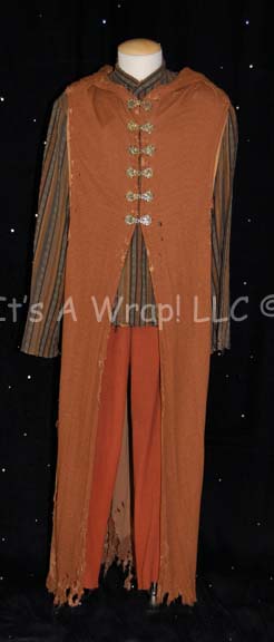 A costume featured in the Star Trek: Enterprise episodes “The Forge” and “Awakening”. This costume consists of long-sleeved, wrap-around tunic featuring various colors and styles of vertical stripes, orange, overall-style trousers, and a rust-colored, long-sleeved, cloak with intricate, gold-colored, metal clasps down the front. All items are distressed in the … |