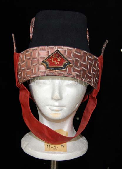 A hat made in the style of those from the earlier Star Trek feature films. This item is a black, square-topped, Vulcan-style hat featuring a wide, light cranberry-colored trim with a ‘woven’ pattern and gold-colored detail made into stylized Vulcan ‘ears’ on the sides and a large, circular accent on … |