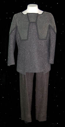 A dark gray two tone costume comprised of pants and a neoprene top worn by Chester Tripp while portraying “Garak” during stunt performances, all befitting “Deep Space Nine's resident ex-spy. Interior Deep Space Nine tags and costumer’s tags indicate wears by ‘Chester Tripp’. |