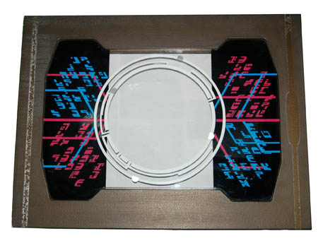 A textured painted wood particleboard computer console with a clear interface featuring a round ‘screen' and blue and pink applied Ferengi character letters featured in episodes of Star Trek: Deep Space Nine, and possibly making an appearance in the Star Trek: Enterprise episode “Acquisition”. Measures approx. 20 X 26.5 X … |