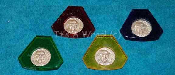 A lot of four gambling tokens used to play ‘Dabo’ at “Quark's” (Armin Shimerman) bar in various episodes of Star Trek: Deep Space Nine. Made of red, green, yellow, and blue acrylic, each chip comes with a metallic silver inset etched with Quark’s smiling face, inscribed in English ‘Quark’s’ with … |