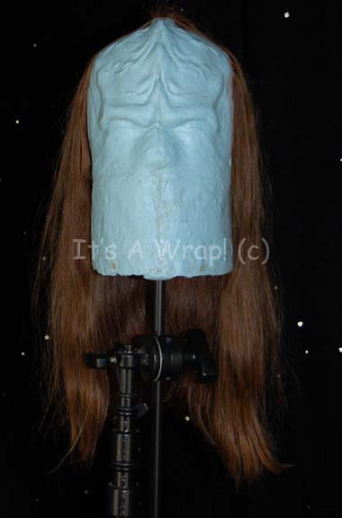 A wig block created for use by the Star Trek hair department for “Worf” (Michael Dorn). The item is a cast head sculpture made to represent the unique styling of Worf’s cranium upon which to set wigs. The item is molded foam with a light blue colored external rubber coating; … |