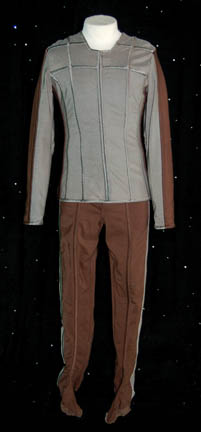 A gray and brown uniform jumpsuit worn by acclaimed actor Charles Rocket during his guest starring role on Star Trek: Voyager as “Jippeq”, commander of an alien generational starship. The jumpsuit features tailored legs with ‘footies' and a matching long sleeved uniform jacket. The interior Voyager tag reads ‘Charles Rocket’. |