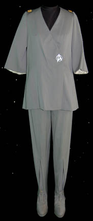 A costume of the style featured in various earlier Star Trek feature films. This costume consists of a long-sleeved, off-white robe featuring pleated, bell-sleeves, attached hood, and a zip up the back. A blue-gray tabard on the chest and upper back that features one remaining white tassel with gold trim; … |