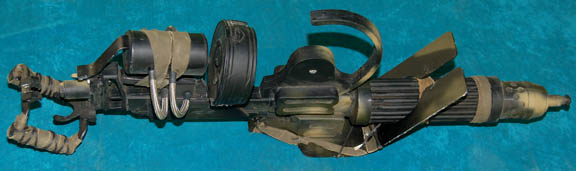 A prop weapon, a vehicle mounted, explosive decompression, machine gun featured in Star Trek X: Nemesis for use on all terrain vehicles used by Kolaran Raiders. The item is black molded plastic with green canvass wrappings and spray painted camouflage. The item features metal woven tubes, twin hand holds, a … |