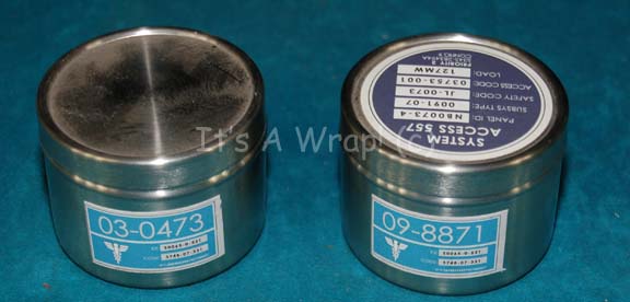 A pair of set dressing containers appearing variously in episodes of Star Trek: Enterprise on the Sickbay set. The items are metal containers with removable lids that measure approx. 1.75 X 2 inches diameter. Both items feature Starfleet inventory applications colored blue with white cadesus graphics, one lid features a … |