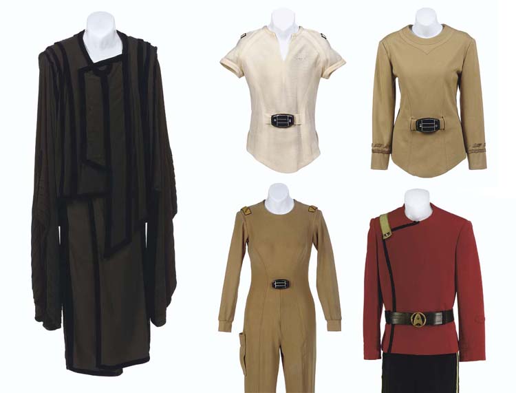 Seven costumes representing each principal member of the bridge crew from the original <I>Star Trek</I>, comprising: a cream-colored "Class-B" Reuben-style short-sleeved shirt, with epaulette tabs with Captain's stripes and loose bio-monitoring belt buckle, label inside inscribed <I>W. Shatner</I> -- believed worn by William Shatner in <I>Star Trek: The Motion Picture</I>; … |