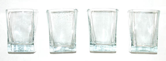 A set of four square shaped juice glasses procured for various Star Trek television episodes. With an ‘X' crossing from one corner of the weighted base to the other, these glasses also feature beveling up the corners of the vessel. The items measure approx. 4 X 3 X 3 inches. |