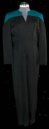 A Starfleet uniform jumpsuit featured in various episodes of Star Trek: Voyager for wear by Robert Picardo in his portrayal of “The Doctor”. The costume is a black full length jumpsuit with sciences blue division shoulders and a gray turtleneck long sleeved undershirt. The costume features a significant degree of … |