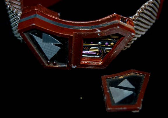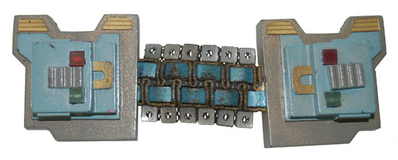 Worn by “Jake Sisko” (Cirroc Lofton) in the episode “The Muse” after a run in with an alien succubus, this cast resin medical prop is painted gray with teal and gold accents with a switch that activates green and red intermittently flashing lights powered by two 3volt ‘Duracell' DL1620 sized … |