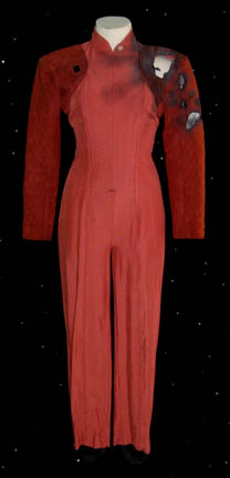 A rust colored Bajoran military uniform with quilted sleeves and shoulders featuring the familiar black diamond thread pattern. From the “Major Kira” collection of costumes, this was worn by stunt actress Denise Roberts during the episode “Defiant” of Star Trek: Deep Space Nine and features an attached ‘major' rank, and … |