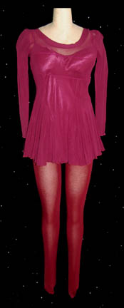 A satin burgundy mini dress with spaghetti strap and a matching sheer over dress worn by Chase Masterson while portraying the Bajoran Dabo girl ‘Leeta' in the episode “Bar Association” of Star Trek: Deep Space Nine. Comes complete with two pairs of corresponding burgundy tights with footies and a pair … |