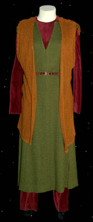 A pair of rust colored cordouroy jumpsuits with two green wool over dresses, a borwn crochet vest, and a brown leather belt, woven with black metal studs that snaps together all worn by Nana Visitor and her stunt double, Denise Roberts, while portraying “Kira” in various episodes of Star Trek: … |
