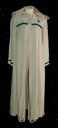 An extremely soft cream colored robe that snaps from right to left and sleeveless under dress presumably worn by Terry Farrel while portraying “Jadzia Dax” during the episode “Equilibrium” of Star Trek: Deep Sapce Nine. When Dax is confronted by powerful images coming to her in waking dreams she realizes … |